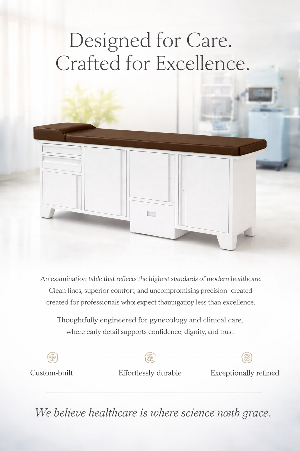 Each product is developed with ergonomic design, infection-control surfaces, and heavy-duty construction.